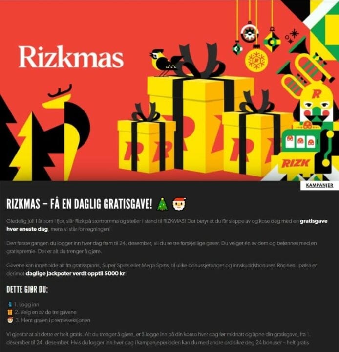 Merry Rizkmas! At Rizk Casino you can join the exciting Christmas calendar Rizkmas, who gives you daily gifts and bonuses until Christmas Eve. This is a fun advent calendar with many different offers.