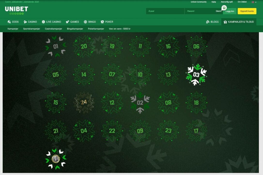 Unibet's Advent calendar is active in the period between December 1 and 24 (even Christmas Eve). That means the calendar is active right now!