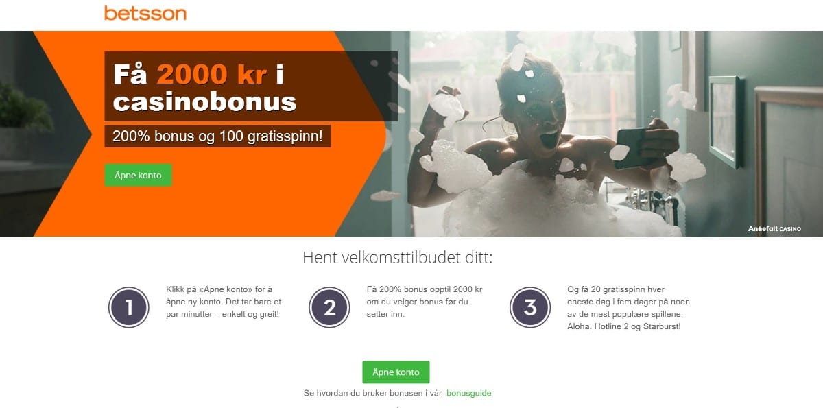 New players at Betsson can receive a great welcome bonus that provides a 200% casino bonus. This bonus applies to up to a maximum of NOK 2,000. In addition to the money bonus you will receive 100 free spins at Starburst, Aloha! Cluster Pays and other popular games.