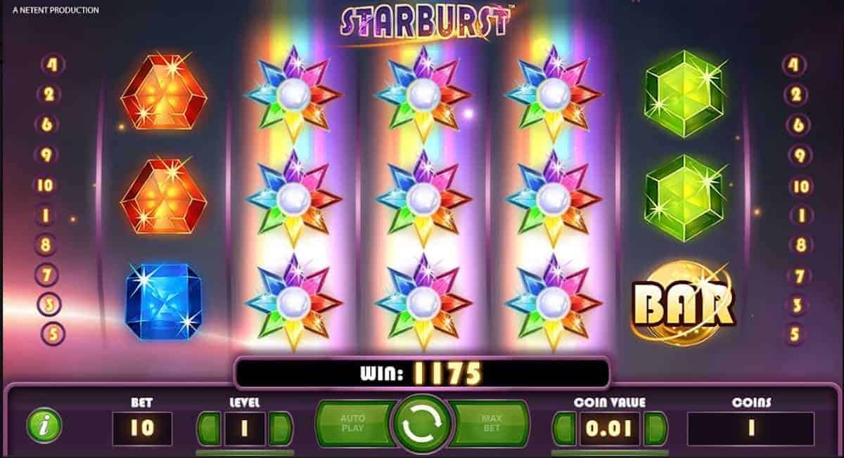 Starburst is a slot machine that has a retro and arcade-inspired theme. The colorful game has space as a theme, with stars and jewels as symbols.