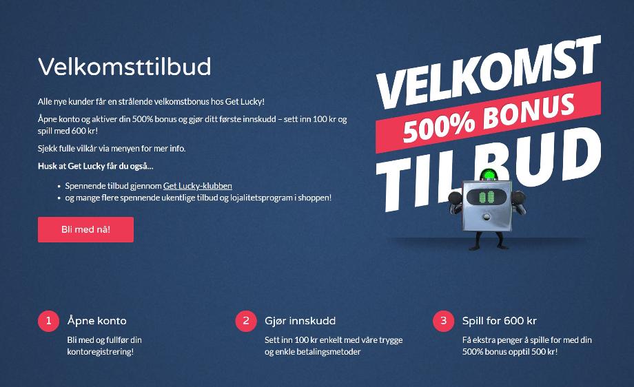 To receive the favorable welcome bonus, you just need to create a user account by following the link on this page. You can then deposit NOK 100 and receive NOK 500 from the casino.