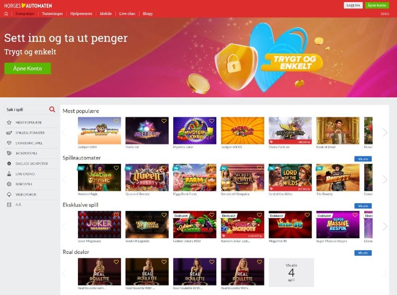 Norgesautomaten has a wide selection of classic slot machines and exciting video slots. In addition to this, they can tempt with jackpot machines with huge progressive jackpots, as well as table games and live casino games with live dealers.